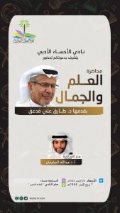 وفي مساء الأربعاء الأول من شهر ربيع الثاني للعام ١٤٤٤هـ الموافق ٢٦ أكتوبر ٢٠٢٢م يستضيف النادي عند الساعة السابعة والنصف الدكتور / طارق بن علي فدعق عضو مجلس الشورى السابق في محاضرة يتحدث خلالها عن ثنائية العلم والجمال ، وسيبحر المحاضر -بإذن الله – مع مضامين هذه الثنائية التي تتشكل منها مفاهيم القيم الجمالية في ضوء المعطيات الإنسانية المبنية على نتائج علمية ذات صلة ، بالناس والحياة ، وسيدير المحاضرة الدكتور / عبدالله الجغيمان عضو مجلس الشورى السابق.